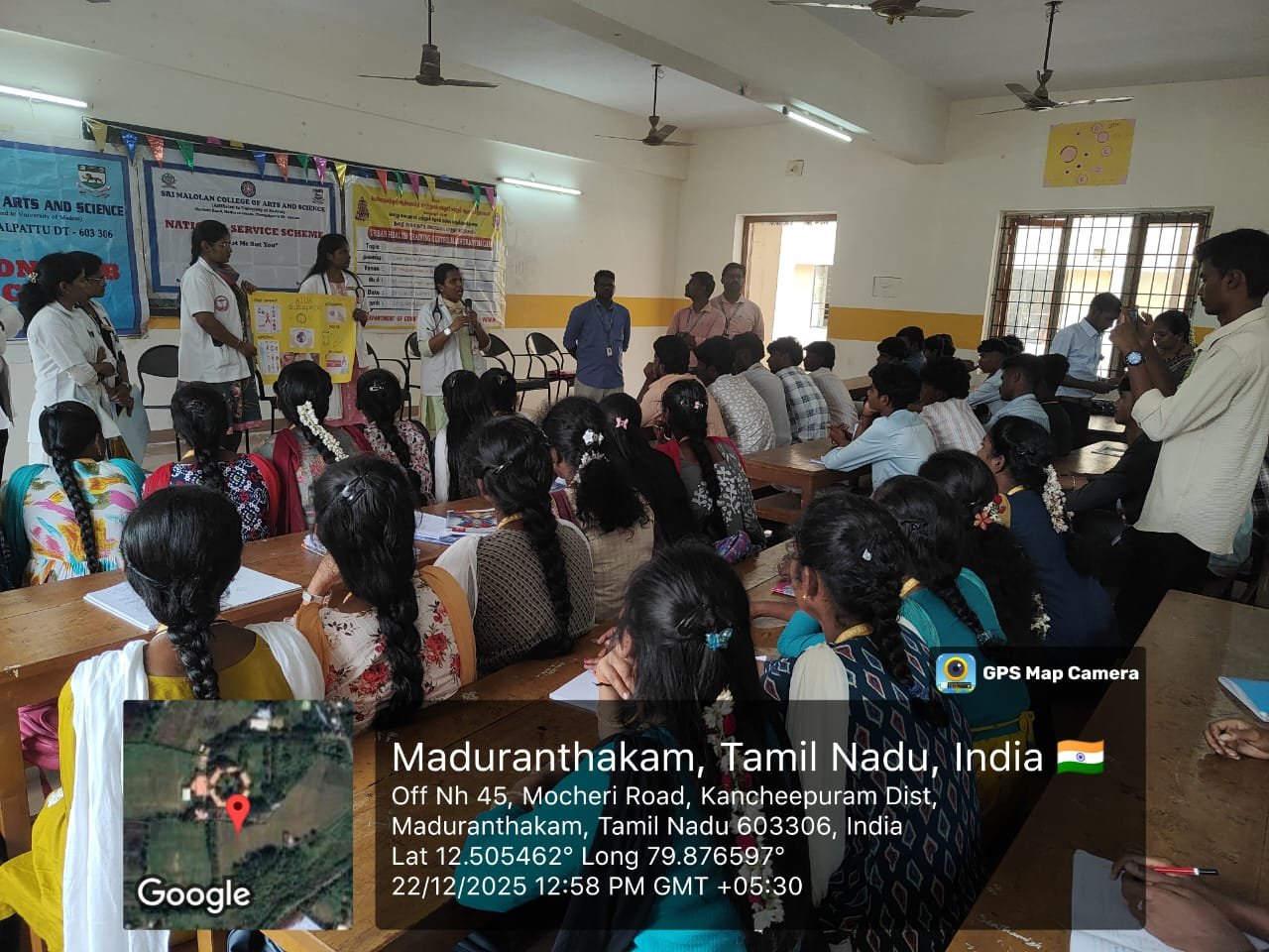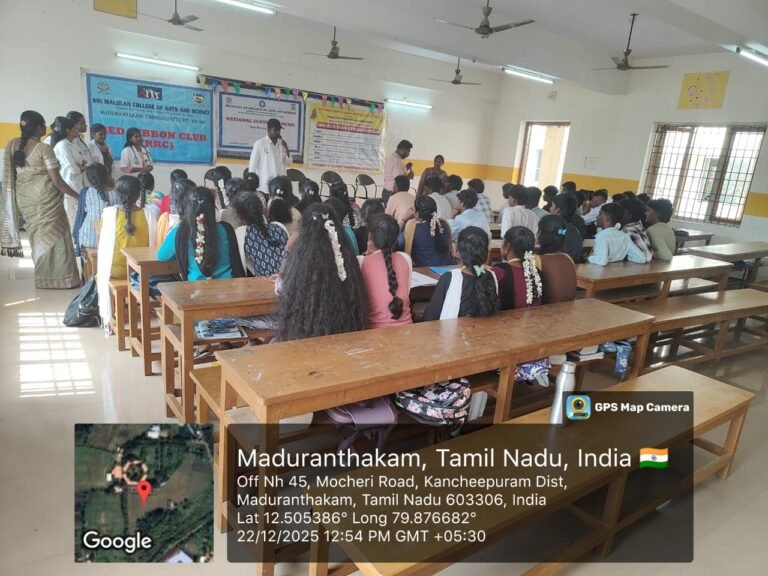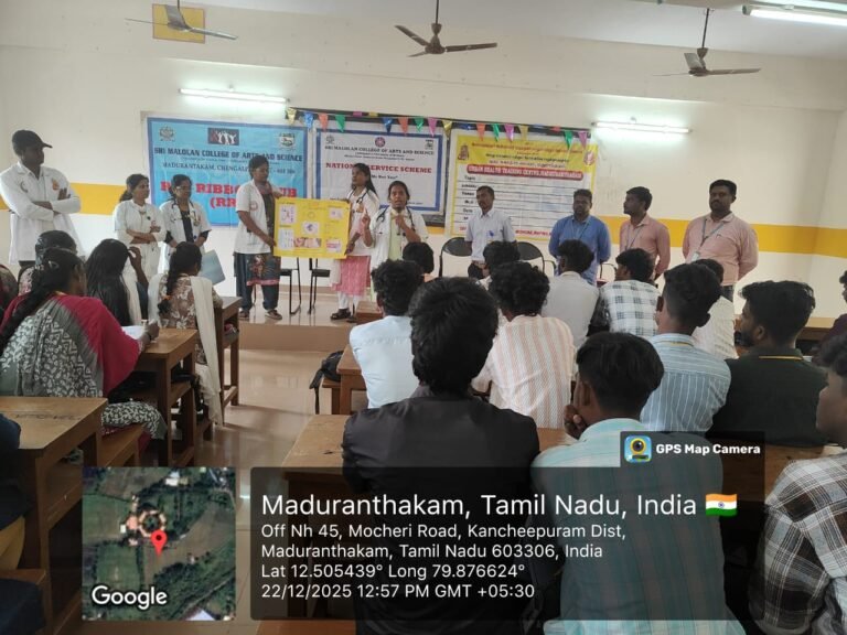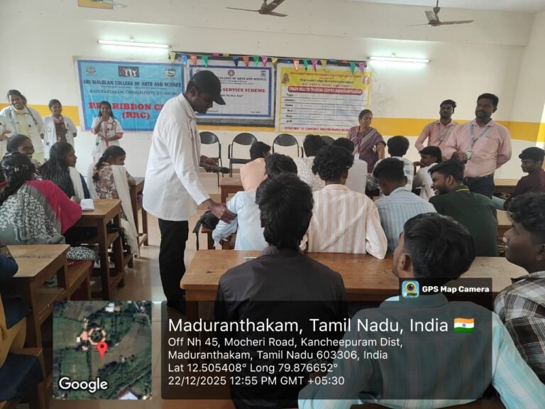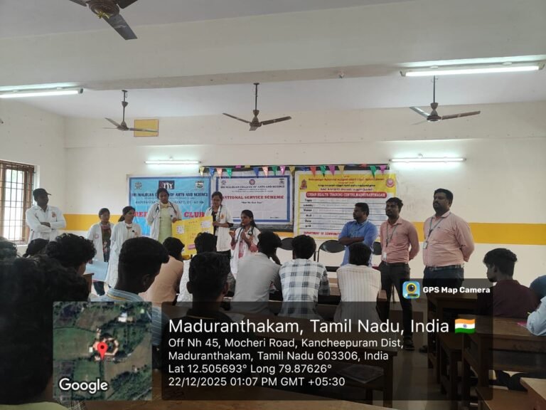 The two NSS units and the Red Ribbon Club (RRC) of our college successfully conducted an AIDS Awareness Programme in collaboration with Melmaruvathur Adhiparasakthi Institute of Medical Sciences and Research on 22-12-2024. The programme aimed to create awareness among students about HIV and AIDS and to promote responsible and healthy behavior. Doctors delivered informative sessions explaining the causes, modes of transmission, symptoms, prevention methods, and available treatments for HIV/AIDS. They also addressed common myths and misconceptions and emphasized the importance of early diagnosis, safe practices, and social responsibility towards people living with HIV/AIDS.