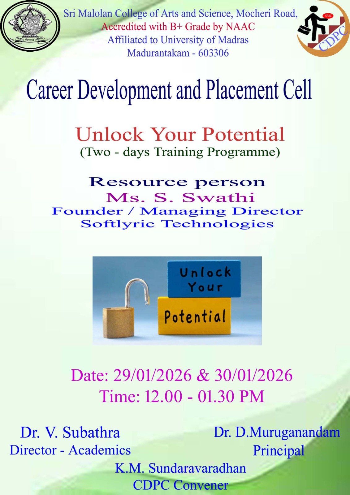 The Career Development and Placement Cell (CDPC) organized a two-day Training Programme titled “Unlock Your Potential” for final-year students on 29th and 30th January 2026. The programme was led by Shri S. Swathi, Founder and Managing Director of Softlyric Technologies, who served as the Resource Person. The sessions focused on enhancing students’ self-confidence, communication skills, career readiness, and professional development. More than 200 students actively participated and benefited from the programme.