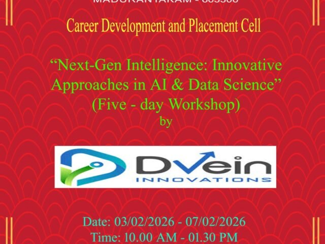 The Career Development and Placement Cell (CDPC) organized a five-day workshop titled “Next-Gen Intelligence: Innovative Approaches in AI and Data Science” for final-year students from 3rd to 7th February 2026. The sessions were handled by faculty members from Dvein Solutions. The workshop provided in-depth exposure to emerging trends in Artificial Intelligence and Data Science, along with practical insights and hands-on learning experiences. A total of 120 students actively participated and benefited from the programme.