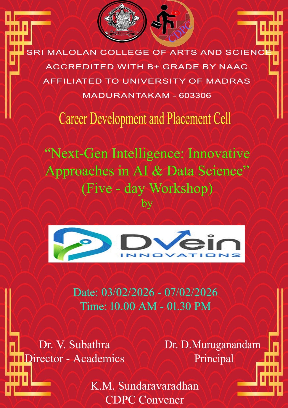 The Career Development and Placement Cell (CDPC) organized a five-day workshop titled “Next-Gen Intelligence: Innovative Approaches in AI and Data Science” for final-year students from 3rd to 7th February 2026. The sessions were handled by faculty members from Dvein Solutions. The workshop provided in-depth exposure to emerging trends in Artificial Intelligence and Data Science, along with practical insights and hands-on learning experiences. A total of 120 students actively participated and benefited from the programme.