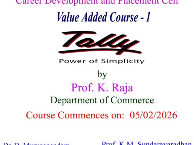 The Tally course, conducted by Prof. K. Raja (Department of Commerce), commenced on 05/02/2026. Office Automation and Basic Hardware began on 12/02/2026 and it was handled by Prof. A.C. Kothandaraman (Department of Computer Science), and the Training Programme on Basic Hardware session was led by Prof. V. Kumaresan (Department of Computer Application).